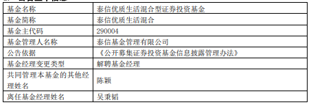 中国经济网北京12月12日电 今日,泰鑫基金发布公告称,吴秉涛辞去泰鑫品质生活混合职务,由陈瑛管理。陈颖曾任北京德丰华投资公司研究员、光大证券资产管理有限公司研究员、敦和资产管理有限公司基金经理、高级分析师、神港证券投资经理。 2021年12月加入泰信基金管理有限公司,2022年1月17日起担任基金管理人。泰信品质生活组合成立于2006年12月15日,截至2025年12月11日,其本年收益率为10.78%,成立以来收益率为53.97%,合并净资产为1.7559元。